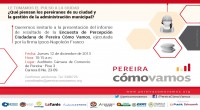 Alejandro García Ríos, coordinador de Pereira Cómo Vamos Ver resumen de los resultados Ver resultados completos (Pereira, 12 de diciembre de 2013) Con una masiva asistencia de público el programa Pereira Cómo Vamos presentó los resultados de la Encuesta de Percepción Ciudadana de Calidad de Vida, contratada con la firma Ipsos-Napoleón Franco. Es la Encuesta más grande que se hace anualmente en la ciudad que pregunta que sienten, piensan y opinan los habitantes de Pereira sobre su ciuda